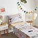 What You Get: 4-Piece Toddler Bedding Set includes: 1 reversible comforter (42x57inch), 1 reversible pillowcase (20" x 30"), 1 flat top sheet (45" x 60") and 1 fitted bottom sheet (28" x 52" x 8"). All pieces are measured to fit a standard size toddler bed.