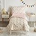 What You Get: 4-Piece Toddler Bedding Set includes: 1 reversible comforter (42" x 57"), 1 reversible pillowcase (20" x 30"), 1 flat top sheet (45" x 60") and 1 fitted bottom sheet (28" x 52" x 8"). All pieces are measured to fit a standard size toddler bed.