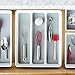 6 GENEROUS COMPARTMENTS: Multi-compartment drawer organizer separates kitchen essentials and streamlines drawers; Keep items organized and ready to use; Sort place setting pieces, knives, forks, spoons, spatulas, whisks, wine stoppers, bottle openers, bag clips, baking utensils and other kitchen gadgets; Get that junk drawer organized - perfect for containing pens, pencils, scissors and other kitchen clutter; Expand the organizer tray to fit any drawer width and create a sixth compartment