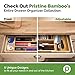 4 GENEROUS COMPARTMENTS: Multi-compartment drawer organizer separates kitchen essentials and streamlines drawers; Keep items organized and ready to use; Sort knives, forks, spoons, spatulas, whisks, wine stoppers, bottle openers, bag clips, baking utensils and other kitchen gadgets; Get that junk drawer organized - perfect for containing pens, pencils, scissors and other kitchen clutter; Expand the organizer tray to fit any drawer width and create a fourth compartment