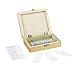 Slide set is packed and fitted in a sturdy shatterproof wooden case that contains interior padding for secure storage and safe transportation
