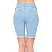 High rise mid-length bermuda denim shorts with rolled hem, 5 pocket styling, zip fly and 2-button closure
