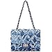 MATERIAL: This roomy blue distressed denim crossbody flap bag has a beautiful quilted design on intentionally faded denim. The shoulder strap is rapped with gold-tone chain. The clean blue fabric interior has a pocket along with a large zipped pocket.