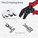 【RATCHETING DESIGN:】There is a ratcheting mechanism design for this insulated terminals crimping tool, one-hand operation could make a perfect crimp without too much effort. The ratcheting function allows to secure a wire connector while you can insert the wires into the crimp.