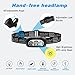 【Super Bright and Motion Sensor】The headlamp flashlight uses high power LED chips that has the maximum brightness of 500 lumens,can easily spot a distance of 350 FT. which can gives you a large area of light for any nighttime mission.It added motion sensor mode, you can easily turn the lights ON/OFF by waving your hand. This is very convenient when your hands are not free