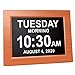 Key features - This unique 8 inch high resolution digital alarm clock clearly spells out the time, period of the day, full day of the week, month and date in large, clear letters with no confusing abbreviations