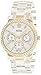 Gold watch round featuring white dial, rhinestone covered bezel, and white silicone band with buckle
