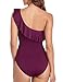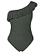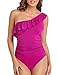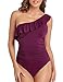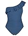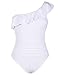 Off the shoulder one piece swimsuit features ruffle trim; Asymmetric one shoulder neckline