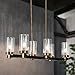 [LINEAR CHANDELIER] Crated from metal, This black and gold modern island lighting adopted painted black and copper plating finish, paired with high quality cylinder clear glass shades. A touch of gold add luxury and elegant feel to this chandelier. The 5-light proved warm illumination to your room. This linear pendant lighting is perfect to match well with your dining room, living room, kitchen island light, etc.