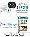 Weather Resistant & Flexible and Secure storage : With an IP65 weatherproof rating, the outoor security camera is always ready for demanding weather conditions like rain, shine, or cold, so you can install it anywhere, especially outdoors. Which alo supports both SD card (max 128G, not included) and Cloud Storage. No subscription fee needed.