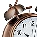 Retro twin bell analog alarm clock. Elegant design in a brushed bronze finish. Classic black numbers & hands on white face creates easy viewing. Red alarm hand for extra clarity. Quality metal bells, hammer and legs designed to withstand daily handling. Glass lens can be cleaned easily