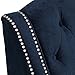 Navy blue velvet upholstery with hand-crafted button tufted details. Fabric is 100 percent polyester. Silver nailhead trim. Espresso finish rubber wood legs.