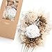 Package Included: pink cypress x3, beige beech leaf x3, pearlite cypress x2, pearl spray x3, 3" Cappuccino Rose x4, 3"golden glove rose x6, 3" tawny beige rose x4, cream dahlia x3, cream Bordeaux rose x2, brown dahlia x2, white pom Albizia x2, baby pine cone x1, 3.5" dusty rose Vendela Rose x1, white Vendela rose x1, beige silk rose x1