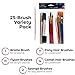 25 Paintbrush Pack: 1 bristle brush (for oil paints), 2 sponge brushes (for any paint or stain), 11 nylon brushes (for acrylic paints), 7 pony hair brushes (for watercolor), 4 camel hair brushes (for watercolor)