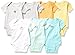 Six short-sleeve bodysuits in baby-soft cotton featuring stripes, prints, and solids