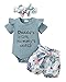 Novel Design: Lovely words express great love from family. Super soft and stretchy materials for comfortable dressing and sporting. Pure romper, ruffle princess shorts and matching headband create more appealing impression. Convenient Snap closure for easy diaper changes.