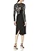 Mesh piping at jewel neck and long sleeves hems and mesh lining under sequin fabric at front yoke, long sleeves, and back yoke and open back bow tie detail. Scuba crepe bodice with curved top bodice seam, princess seams and waist seam, and a below the knee length skirt with a center back slit at hem.
