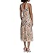 Crew halter neck, back V-neck, sleeveless, piping at waist seam, and midi length skirt.
