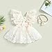 Baby Girls Summer Romper: This short jumpsuit is designed with a floral lace and embroidery skirt layer, solid colors, backless, adjustable shoulder straps, elastic cuffs, and a snap triangle bottom that is very easy to change diapers or dress up.