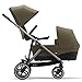 Premium design with an all-aluminum frame with taupe finish, leatherette handlebar and bumper bar, and high-quality fabrics, All-wheel suspension with integrated frame shock absorption system provides a smooth ride over a variety of surfaces, Extendable XXL sun canopy with mesh window and a UPF 50+ rating, Large seat unit reclines to a near-flat position, 50 lb. weight capacity for both seat units, One-hand height-adjustable handlebar offers comfortable steering for all users,