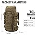 【Durable Material】65L, 11.4"*8.3"*33.4". This tactical backpack is made of 600D polyester. YKK Zipper. Rain Cover Included.