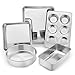 5 PACK ECONOMICAL KIT: 12.5 x 10 x 1-inch toaster oven pan, 8 inch round cake pan, 8 inch square cake pan, 11.3 x 7 x 1.25-inch 6-cup muffin pan, 9.25 x 5 x 2-inch loaf pan, All pieces are oven safe to fit most regular home oven, A compact bakeware set in your kitchen, More economical than buy them separately