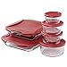 INCLUDES: This storage container and bakeware set contains (1) 1-cup containers with cherry lid, (2) 2-cup containers with cherry lids, (1) 4-cup containers with cherry lids, (1) Essentials 8 Inch Cake Dish with Cherry Lid, and (1) Essentials 3 Quart Bake Dish with Cherry Lid