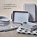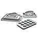 WHAT'S IN THE BOX: Included in this 11-piece bakeware set is a 18x13” baking sheet with handles, 10x15” baking sheet, 12 cup muffin pan, 9x13” rectangle pan with handles, 9” square pan, 1lb loaf pan, two 9” circle pans, 18x13” cooling rack, and two storage organizers.