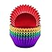 Package of 120 rainbow-colored standard foil paper cupcake baking cups in a sturdy, clear plastic storage box for easy access and easy storage.