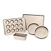 SET INCLUDES: Ayesha Curry bakeware set includes a 10.25-inch x 7-inch perforated crisping pan, 10.25-inch x 7-inch cookie pan, 10.25-inch x 7-inch cake pan, and a 10.25-inch x 7-inch 6-cup muffin pan