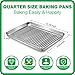 SUPERIOR CRAFT: These stainless steel baking sheets are highly mirror polished to reduce the risk of food sticking and easily release food; Smooth roll rims without sharp angles, make it comfortable to hold. Each stainless steel rack with tight grid has four raised feet, allowing hot air to evenly circulate and bake, keeping meat lifted above juice and easily release. And the baking racks sit neatly inside measuring 16x12 inches baking pans.