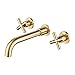 【Classical Cross Handles Design】This wall tub faucet with two classical cross design handles for effortless water flow and temperature control. The water spout equipped with a honeycomb aerator can provide you with gentle and soft water flow which is no-splashing and save 20% water than other ordinary faucet. This wall mounted gold bathroom faucet will be one of the most eye-catching creations in your bathroom.