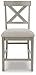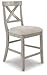 SET OF TWO UPHOLSTERED BAR STOOLS: Relaxed yet refined bar stools add a farmhouse vibe to your space. Gray washed finish is utterly on trend. Seats are covered in easy-care polyester upholstery