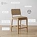 This brown faux leather bar stool highlights a woven leather back rest with beautiful stud details.