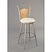 The round 360 degree swivel seat is upholstered in a light ivory fabric