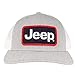 High quality Jeep branded twill trucker-style hat with red, white and blue Jeep Text Logo embroidered patch stitched to the grey twill front. Grey and white camouflage pattern mesh back. 7 Panel Grille Logo tab stitched to the back