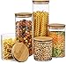 [Convenient & Attractive ] 5 piece kitchen storage canisters set in clear glass to find your kitchen goods quick and easy. The wooden lid and transparent glass offer minimalist and modern design that blends in perfectly with your kitchen corner, bathroom and laundry room.