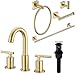 Package Includes - 1 x Faucet Drain Assembly (B07MZ4TK9Z), 1 x 4-Piece Bathroom Hardware Set (B08PBYJ27Q), all in brushed gold finished.