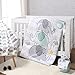 REVERSIBLE CRIB COMFORTER - Generously sized 32" x 41" soft and cozy quilt features a trio of gray and aqua elephant friends a top a wide light gray stripe and surrounded by a sky of moons, clouds, and stars. The reverse side coordinates perfectly with the matching crib sheets.