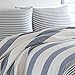 DESIGN: Comforter features a blue and white engineered stripe pattern divided by a grey stripe leading to smaller pinstripes in light blue and white; Reverse is a solid grey