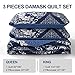 Navy Damask Bedding Set: The quilt set design with white damask pattern on navy blue. Combined with leaves and branches pattern gives this bedspread a stylish and luxurious atmosphere. The indigo boho reversible coverlet set gives an eye-catching update to your bedroom decor.