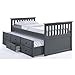 TWIN SIZE CAPTAIN’S BED WITH STORAGE DRAWERS: Twin size captain’s bed with rolling twin size trundle bed; Trundle bed includes 3 storage drawers; Assembly required; Mattresses not included; Trundle bed mattress should not exceed 7 inches in thickness