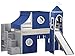 JACKPOT! Castle Twin Low Loft Bed with Stairway in Gray, Blue and White Curtains, Top Tent, Tower and Slide.