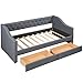 【No Box Spring required】This daybed frame comes with sturdy wooden slats. Mattress is not included. A comfy linen fabric backrest and two armrests that bring you and your family a cozy feeling. The pull-out drawers can storage daily staff, this twin daybed comes with casters that lock in place so your visits don't slide away