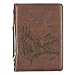 Scripture Bible Case: This handsome brown case features scripture sentiment from Isaiah 40:31 debossed on the front, along with two pine forest scenes on the front and back covers.