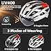【Bicycle Helmet with Detachable Magnetic Visor】Bike helmet visor with with 3 strong magnets, can be used as a sunglasses, not only protect your eyes against wind and sand, but also block the strong sunlight, UV400 protection. It won’t interfere with wearing your own glasses. Bike helmet men women meets your 3 wearing needs-goggles up, goggles down and no goggles, fit for mountain bike and road bike cycling.