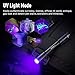 【2in1 UV 365 & 395 ULTRAVIOLET LIGHT】-- Emits 365-370 or 395-400 nanometer wavelength black lights. The 365nm UV flashlight is an invisible light. When irradiated with a substance that does not contain a fluorescent agent or substance, it will show the original color of the goods. On the contrary, the stain is particularly noticeable. The 395nm violet flashlight is a kind of purple light, with higher brightness and farther illumination.