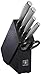SET INCLUDES: 3" Paring Knife, 5" Serrated Utility Knife, 6" Utility Knife, 8" Chef's Knife, Kitchen Shears, Black 5-slot Hardwood Knife Block.