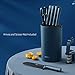 【PERFECT FIT & LARGE STORAGE】 With 9.1 inch height and 5.5 inch diameter, the OOU kitchen knife blocks can fit 12-15 knives, giving you a large-capacity kitchen organizer. Elastic double layer rubber slots design can fit the thicker knife blade up to 5 mm or longer blade up to 9 inch. Suitable for commonly used kitchen knives, such as meat cutters, chef knives, utility knives, steak knives, bread knives, kitchen scissors, etc.