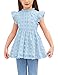 Features: Blouses for girls, solid color, swiss dot, flowy ruffle short sleeve, pom pom detailing, frill neck, high waist design, back keyhole. The shirts for girls take lined fabric so non-see through when your girls wear them.